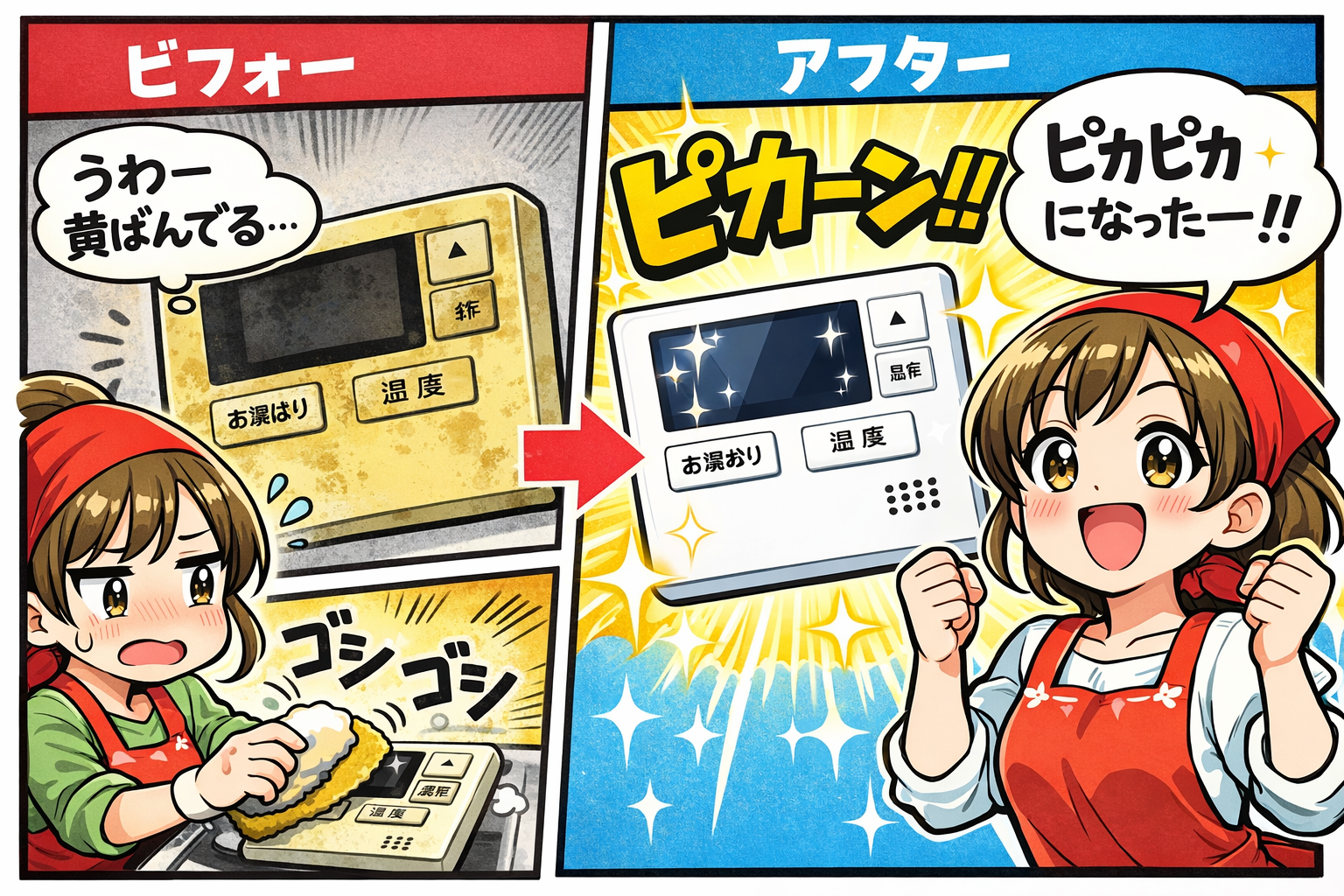 給湯器のリモコン新品で買った時は真っ白くてキレイなのに、何年か経つと、だんだん黄ばんで古臭く見えてしまいますよね。